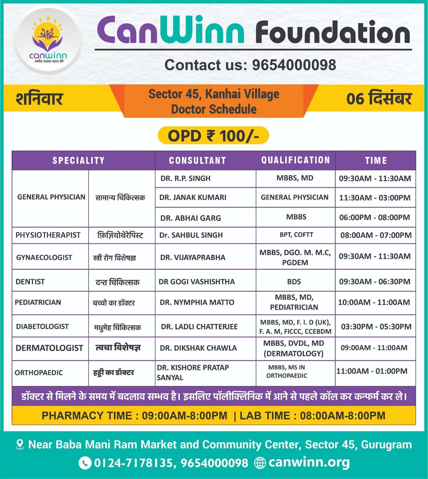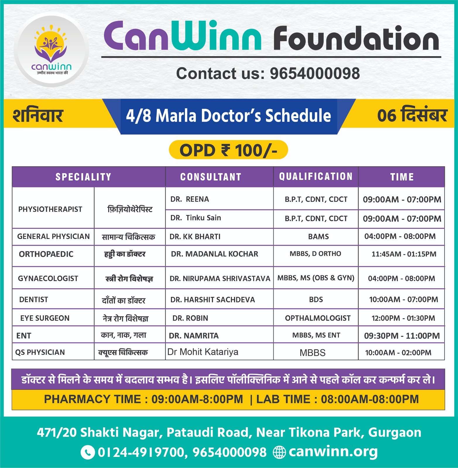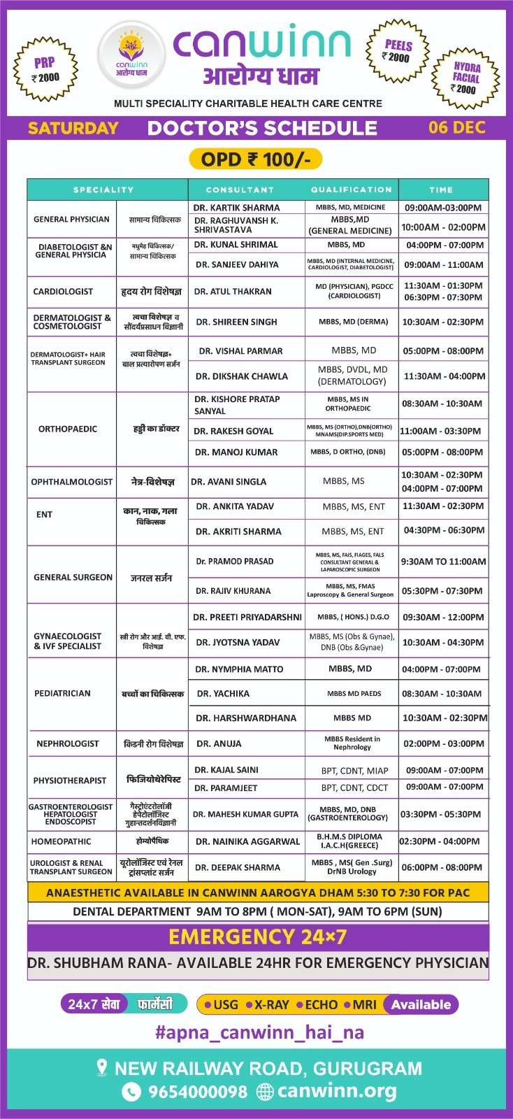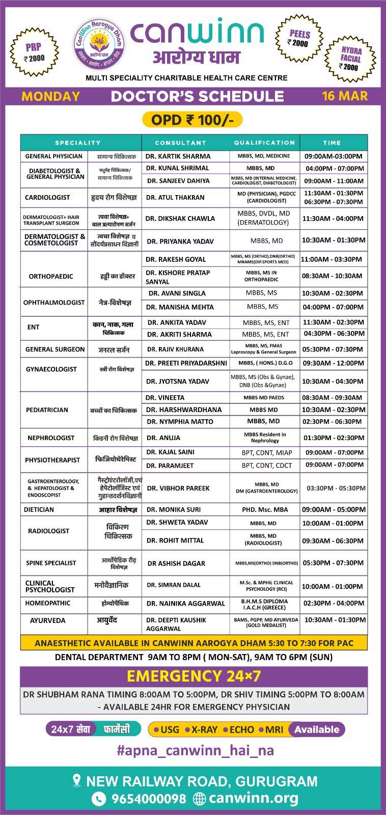 SURGEON Dr. Dharmender Sharma 05:00PM – 07:00PM