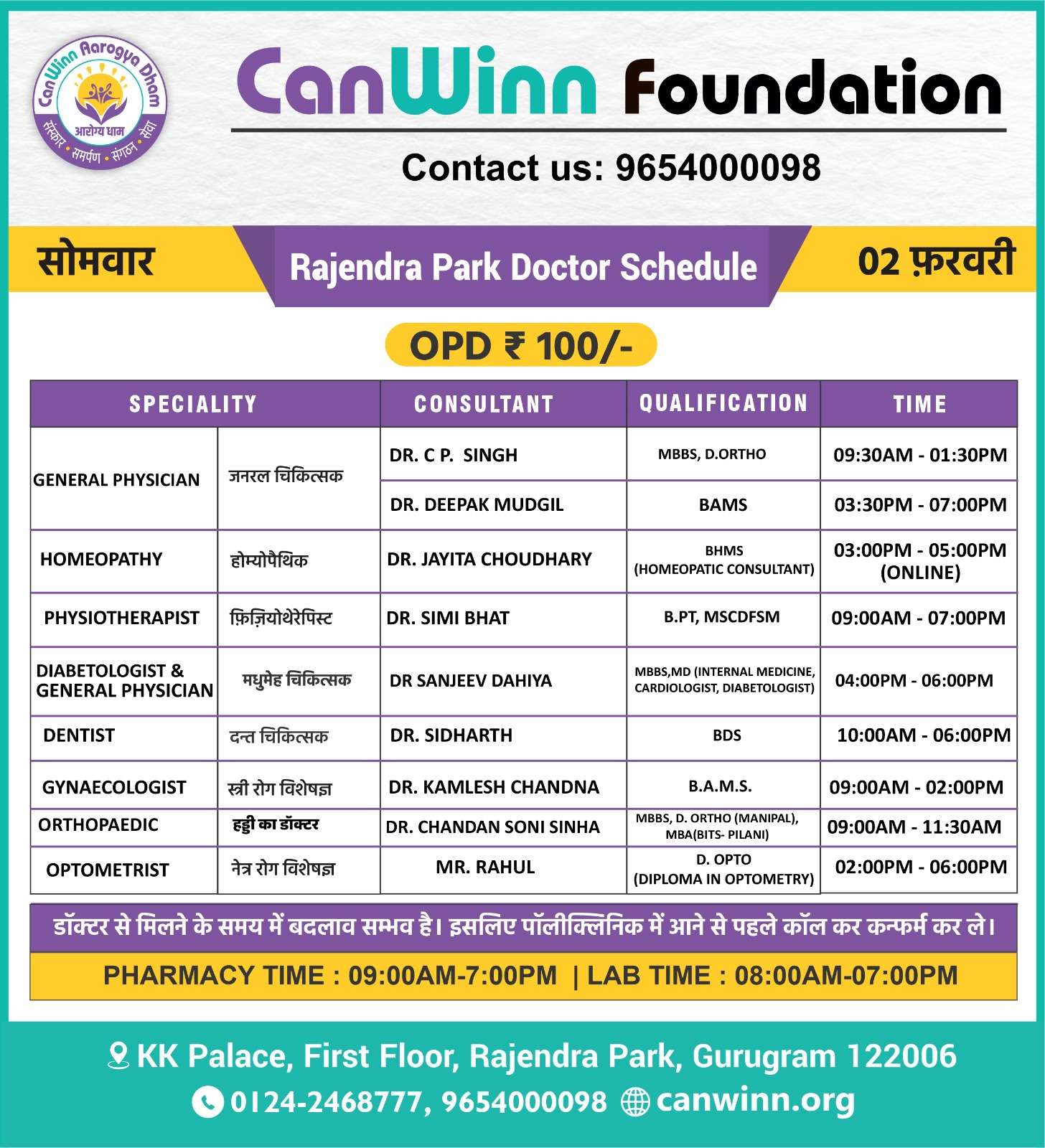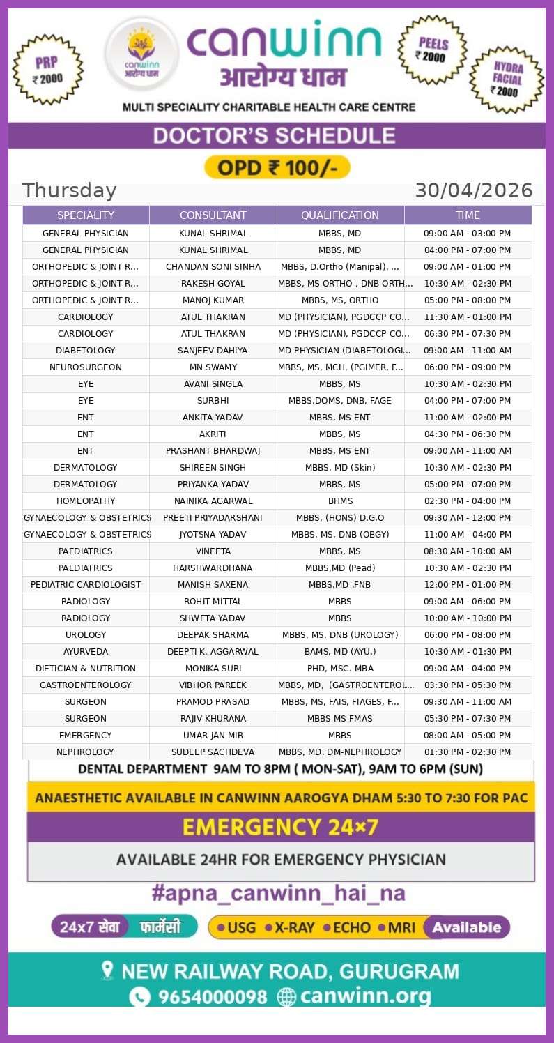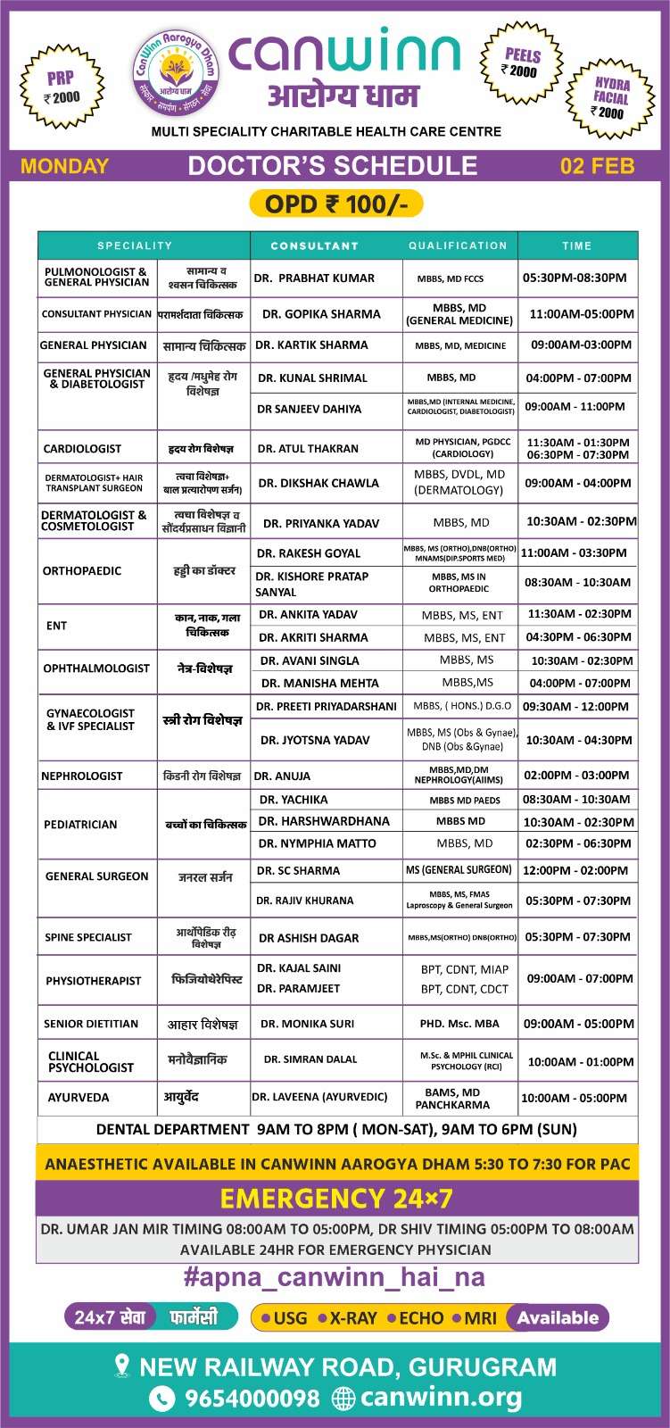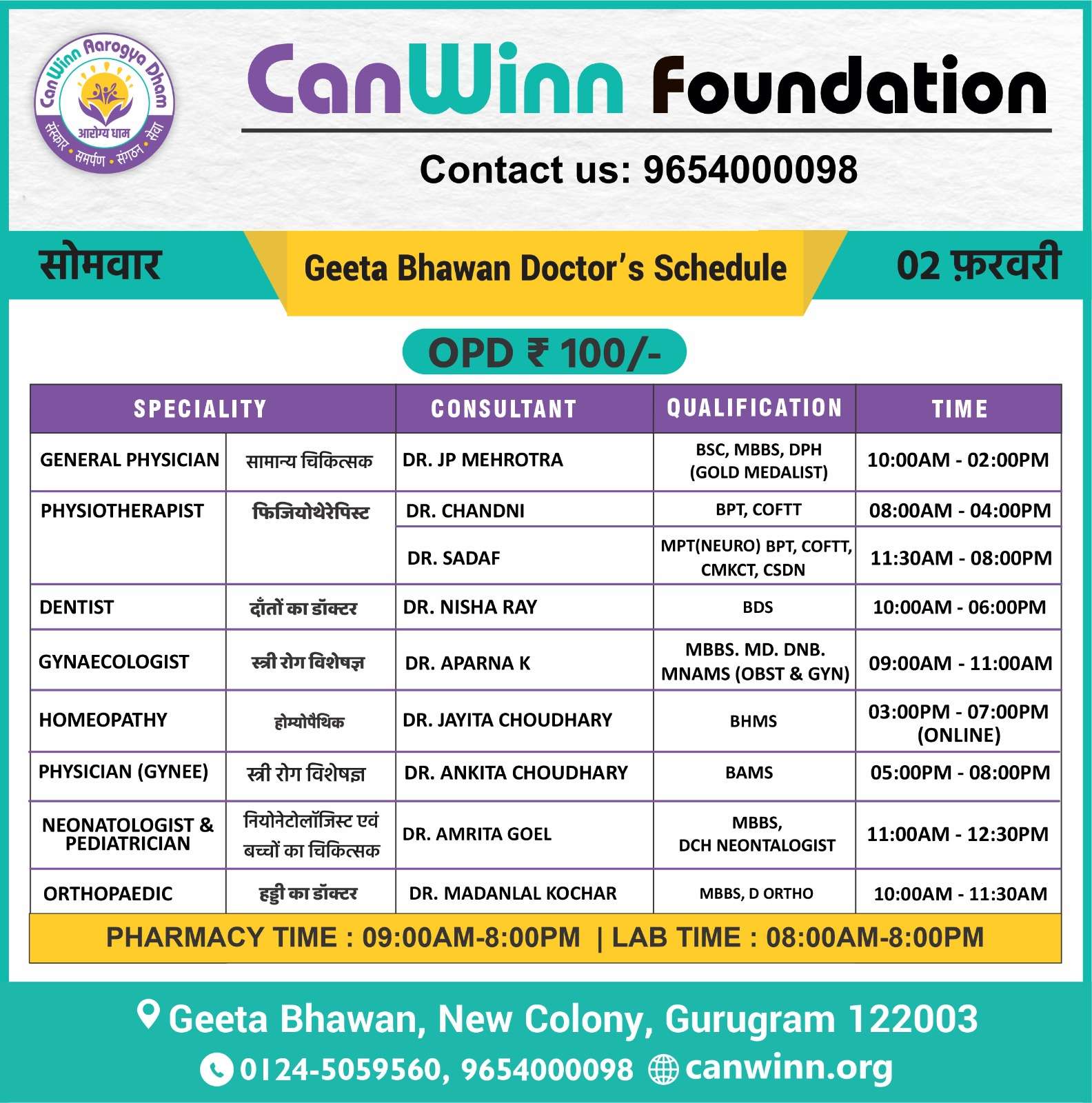 SURGEON Dr. Dharmender Sharma 05:00PM – 07:00PM