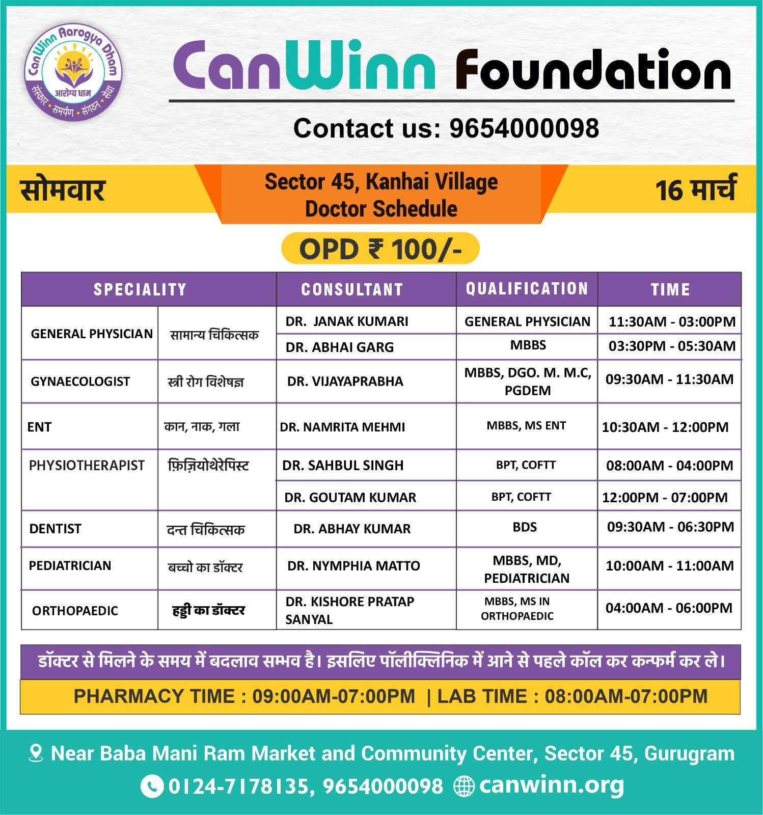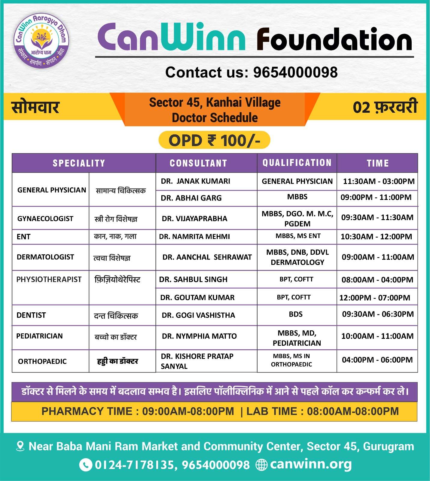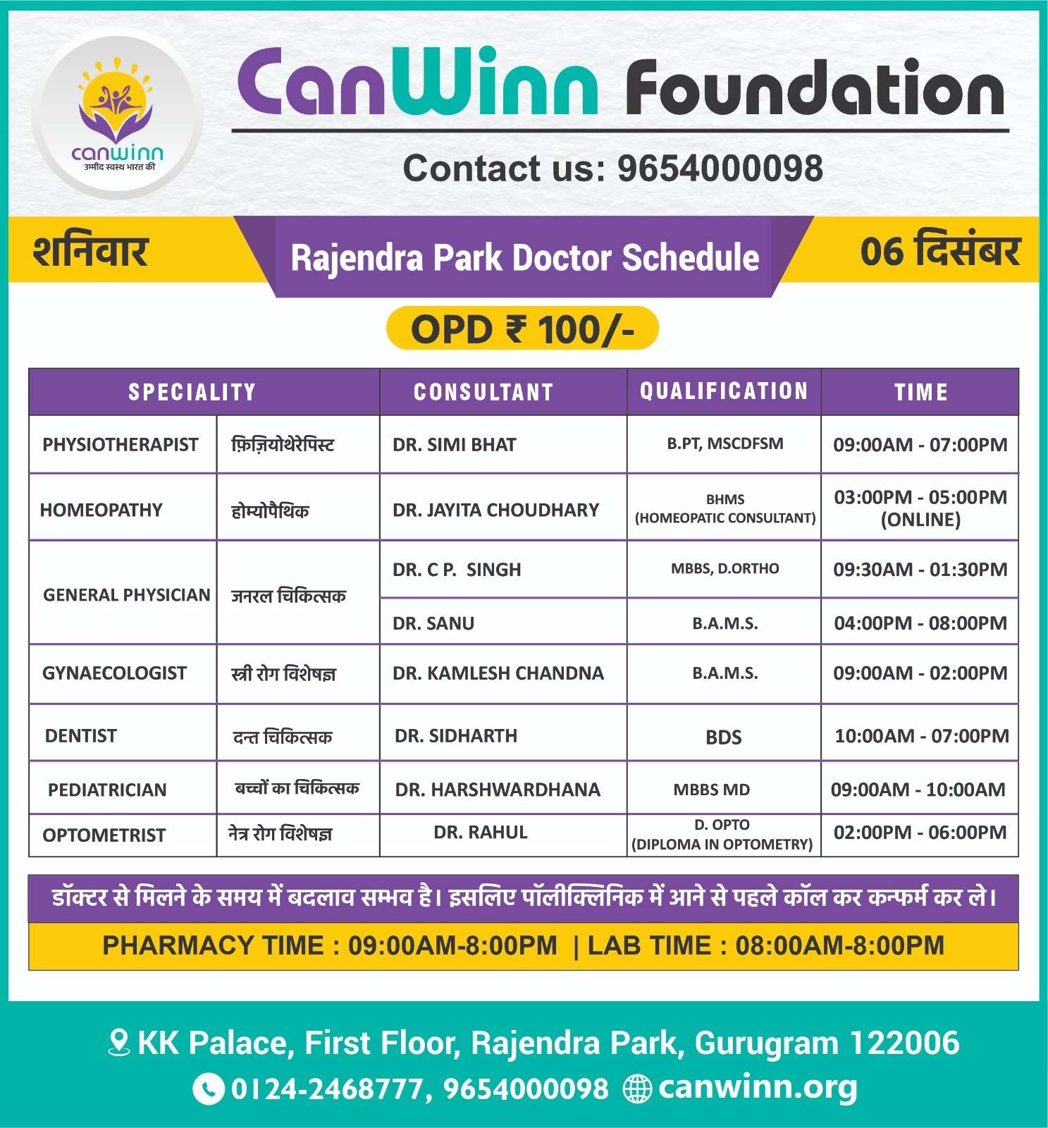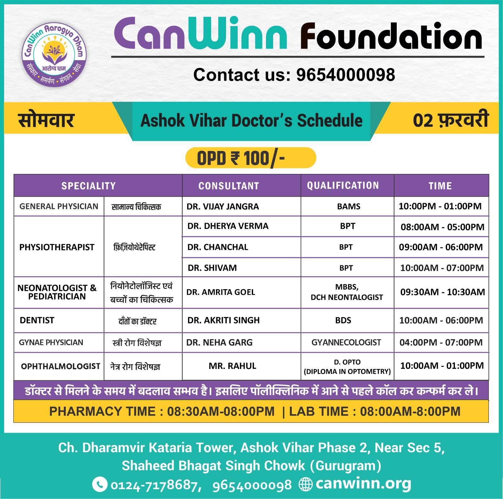SURGEON Dr. Dharmender Sharma 05:00PM – 07:00PM